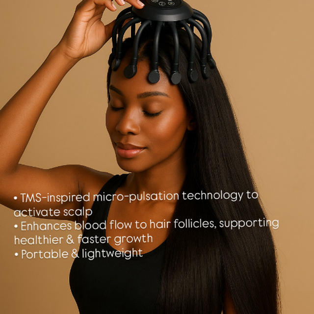 VitaScalp Pulse™ is an advanced scalp massager designed to enhance circulation, relieve tension and support healthier hair growth. With gentle pulse wave technology and soft flexible nodes, it creates a soothing spa level experience that calms the mind and nurtures the scalp. Regular scalp massage is known to stimulate circulation, which can support a faster rate of hair growth over time. By improving the flow of oxygen and nutrients to the follicles, VitaScalp Pulse™ helps strengthen the roots and encourages fuller more vibrant hair. Ideal for daily self care, wash day rituals or relaxing before sleep, it reduces tightness from styling and promotes a balanced revitalised scalp. Lightweight and easy to use, VitaScalp Pulse™ is suitable for all hair types including long and textured styles. Enjoy circulation focused scalp care designed to elevate your wellness and beauty routine.